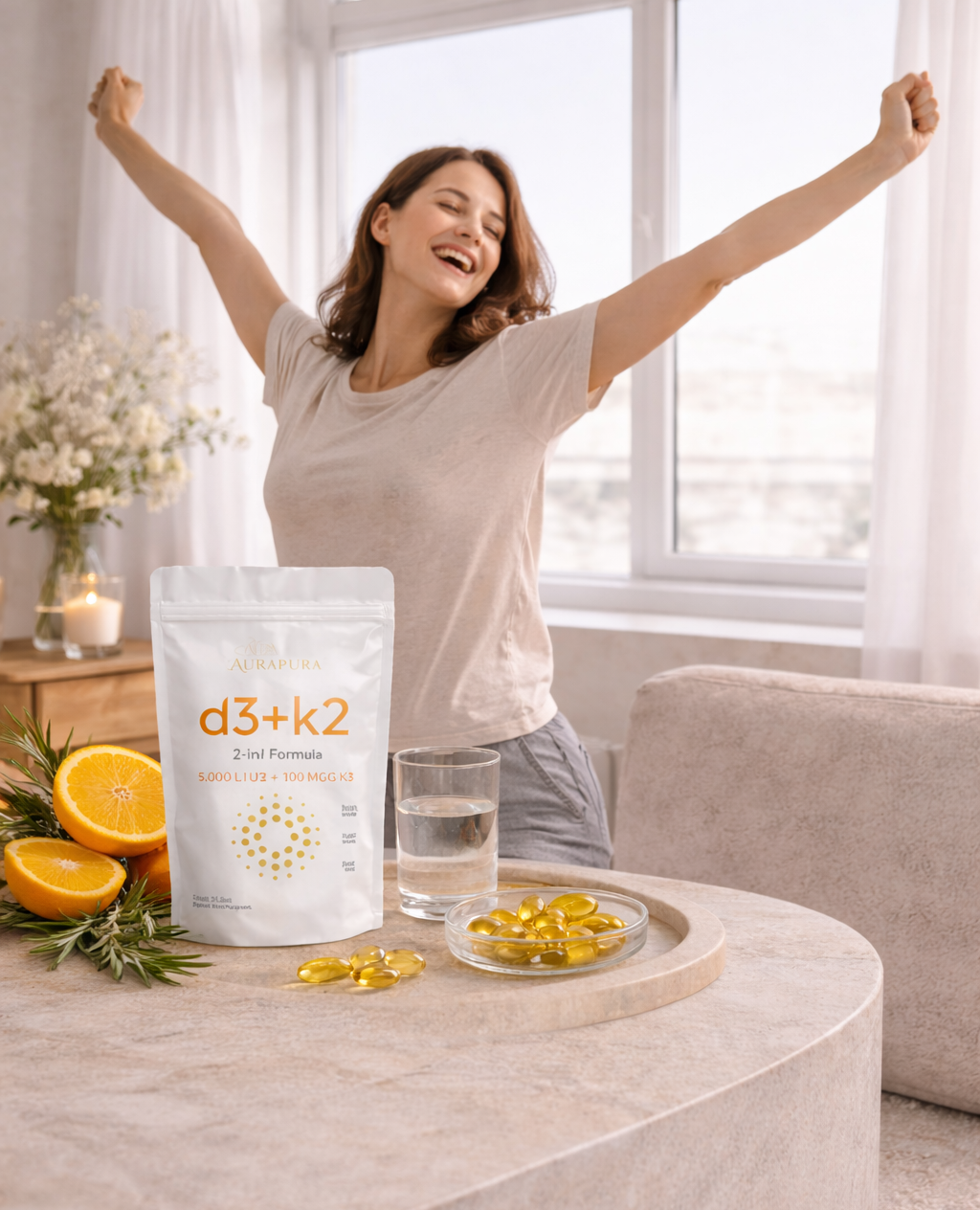 Mit Vitamin D3 + K2 unterstützt du deine tägliche Leistungsfähigkeit und deine Stimmung –für mehr Energie im Alltag ohne großen Aufwand.